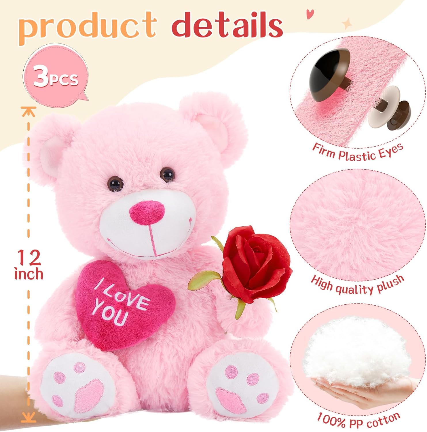 What You Can Get: When you open the package you will see 3 pink teddy bears, each bear plush holding a red heart embroidered with “I Love You”. Boldly express your love to the one you love!
