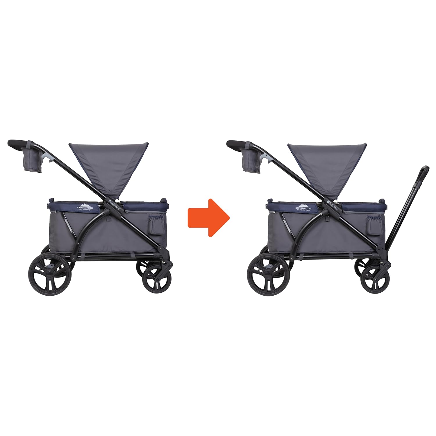 Get Ready for your outdoor adventure with the exclusive Baby Trend® Expedition® 2-in-1 Stroller Wagon! Designed with utility, safety and style, the Expedition® 2-in-1 Stroller Wagon is for the family that loves outdoor activities and discovery. The super large cargo space with built-in seating and the two 3-point safety harness belt allows kids to explore with safety. Plus, the extra-large ratcheting canopy with UPF 50+ protection and air-flow mosquito netting keeps your little ones away from the harmful sun-rays and rain. Parents will also love the Ultimate Storage Solutions, which includes parent and child trays with 2 cup holders and center consoles, plus 2 additional cup holders outside of the wagon. The Baby Trend® Expedition® 2-in-1 Stroller Wagon is equipped with easy one button removable 11″ rear wheels and durable 8″ front wheels for easy maneuverability. With the Hideaway Pull Handle, parents can easily transform the “Push” stroller into a “Pull” wagon mode. The compact flat fold allows the wagon to be easily stored and transported.