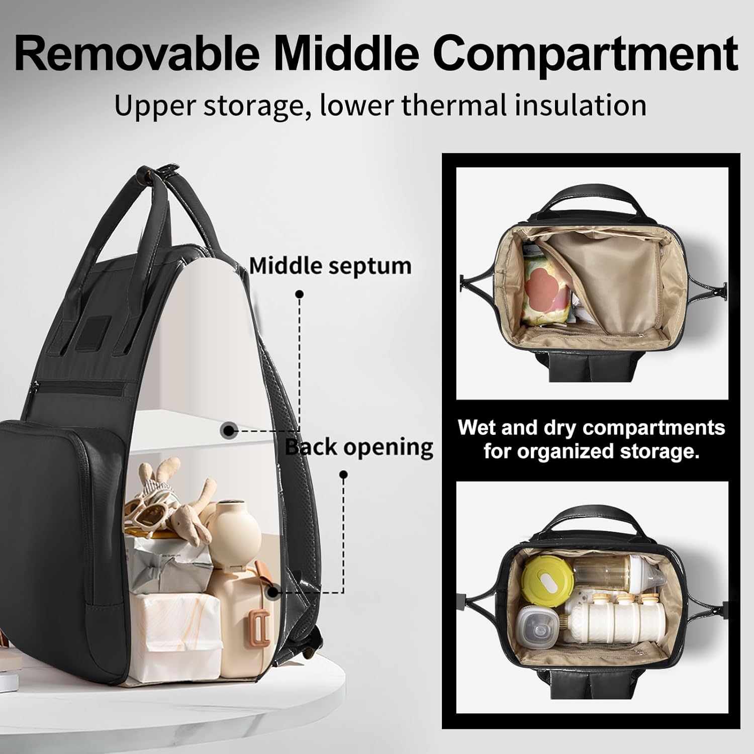 2. Detachable Divider & Back Access for Easy Organization in Diaper Backpack: Effortless organization for mothers traveling with this baby bag. Featuring a removable divider and back opening, it increases insulation and separates the bag into the top and bottom compartments. Perfect for outings, providing easy access to rear child items, reducing the difficulty of managing your baby’s essential features while on the go.