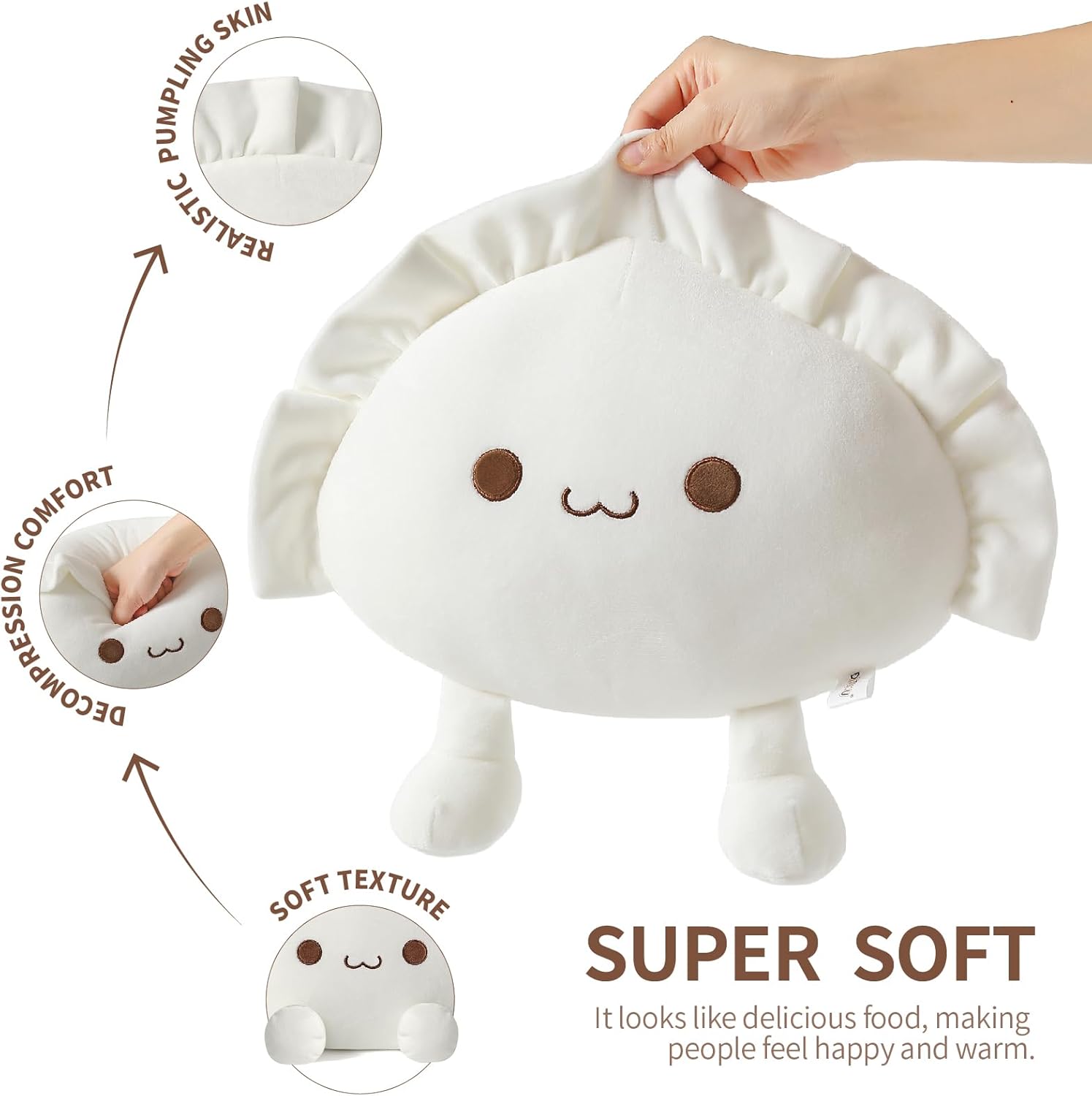 As Gift: Dumpling stuffed animal with an unique appearance and cute expression, which can be used for playing, reading, watching TV and taking a nap. It is really comfortable to hold and supprot your lumbar, we believe it will be a sweet gift for Christmas, Thanksgiving and birthday.
