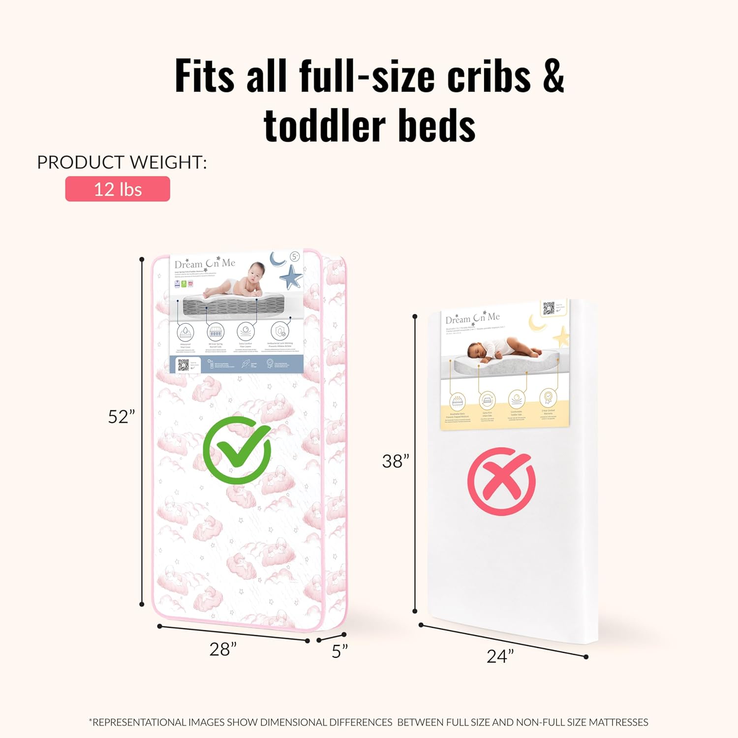 Your baby will curl-up in comfort on the Twilight Spring Coil Mattress by Dream On Me. Constructed with quality materials and workmanship this mattress is manufactured with pride in the USA. This lightweight mattress offers 80 durable, interwoven, heat tempered, steel coils providing supreme comfort and support. The Twilight Mattress also features a lock-stitched waterproof binding for lasting durability. The phthalate and lead free, triple laminated waterproof cover is stain-resistant to help protect against liquids leaking inside. Wipes clean with mild soap and water. Meets the 16 CFR 1632 /1633 Federal Flammability Standards, Greenguard Gold certified and carries a 10 year limited warranty against manufacturer’s defects and materials.