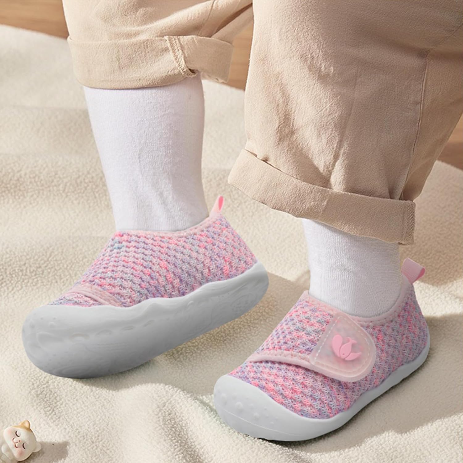 Features: 【Spacious Round Toe】The unique design of the toe can make the baby’s feet free movement, body balance is not afraid of falling, anti-collision to help crawling. 【Knitted Upper】Baby shoes uppers are breathable and moisture wicking, keeping baby’s feet dry and odorless. Suitable for year-round wear, soft inside and not rubs her feet or makes blisters. 【Reinforced Heel Design】Stabilizes the soft tissue of baby’s heel to grow straight and without deformation. Learning to walk is safer, no broken feet. 【TPR Non-Slip Sole】The sole has been subjected to 2W+ friction tests, they are comfortable and have great grip for children who are learning to walk and run around a bit. 【Easy on and off】Convenient hook & loop closure design for easy on and off, fits snugly on baby’s feet. Suit for crawling, walking and playing won’t fall off. Note: 1. Please allow 1-2cm size difference after manual measurement. 2. due to the screen, there is a slight colour difference between the actual product and the product picture.