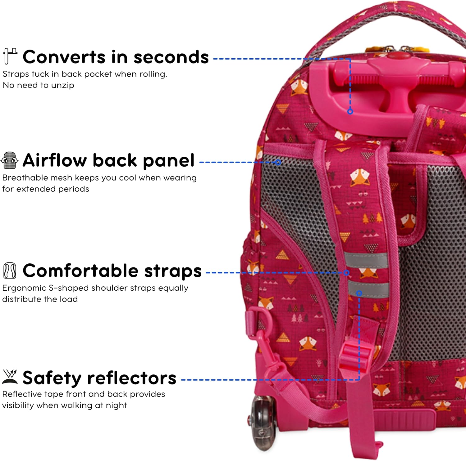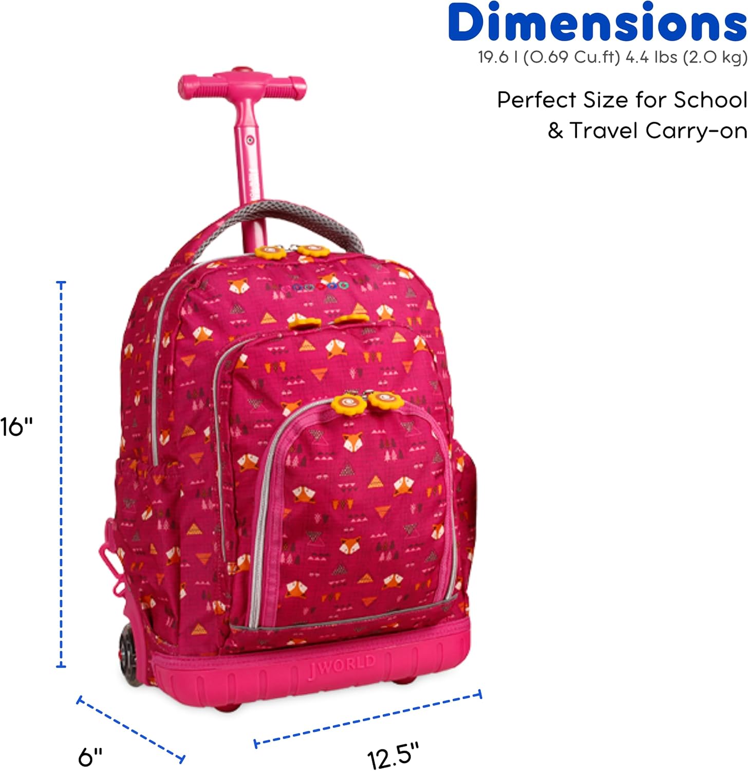 The Sunny rolling backpack includes a matching insulated lunch bag. The rolling backpack functions as both a bag on wheels for school and a fun carry-on backpack for kids age 3 years and up. The roller backpack has a main zippered compartment, 2 exterior zipper pockets and 2 side pockets, plus an internal organizer with key clip, pen slots and pouches for small items. This bag is small enough for kids in Pre-K to 3rd grade to pull—it measures 16 x 12 x 8 inches—yet fits lunch, books and a jacket. The adjustable aluminum luggage handle extends to 26 or 31 inches to be easily pulled by preschoolers and kids 36 to 52 inches tall. To convert into a wearable backpack, just pull-out backpack straps in seconds. When rolling, straps easily tuck away in slot on roller backpack—no having to unzip. Motion-activated LED light-up backpack wheels blink as they turn (No batteries required!) Wheeled backpack rolls and turn effortlessly on sidewalks and paths. This pre-K backpack features a metal frame and a molded bumper to protect against abrasion. Kids backpack and lunch box set is made of durable ripstop polyester fabric. The matching insulated lunch bag keeps food at the right temperature. Holds a sandwich, drink, snack, and ice pack. Measures 10 x 8 x 4 inches. At J World, we stand behind our products 100%. If you have any issues with this rolling backpack for girls and boys, we will make things right.
