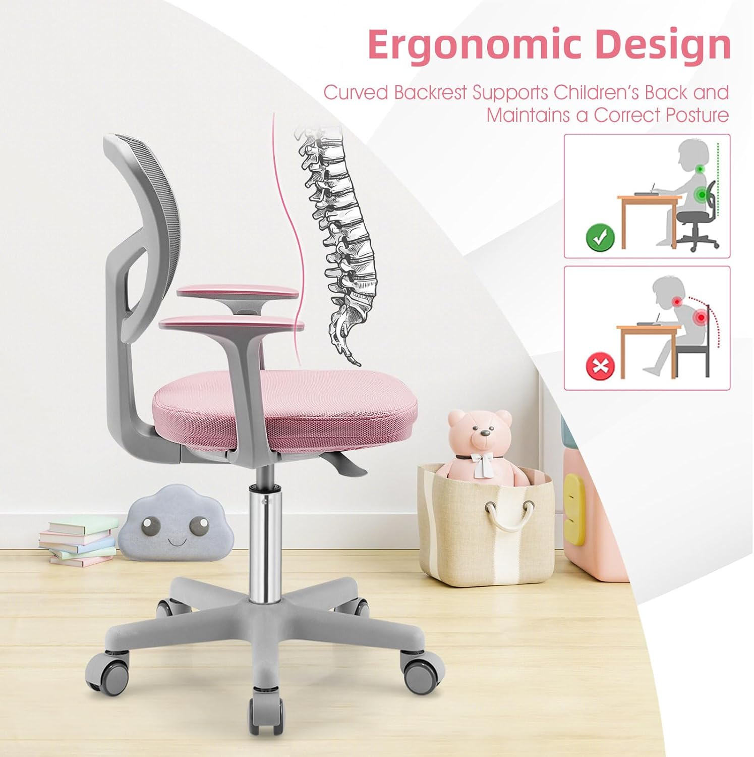 Kids Desk Chair, Ergonomic Kids Swivel Study Chair with Lumbar Support, Breathable Mesh & Universal Wheels, Height Adjustable Kids Computer Chair for Boys & Girls (Pink)