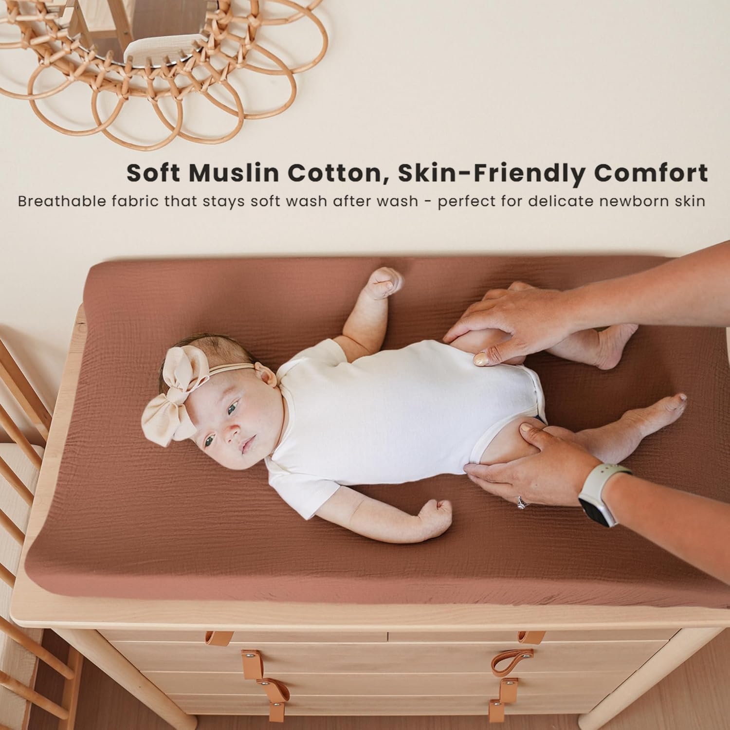 Snug Fit: This muslin changing pad cover is designed with fully encased 360-degree elastic, ensuring a snug and secure fit around the changing pad. This prevents the changing pad cover from slipping or moving around during diaper changes, providing a stable surface for your baby