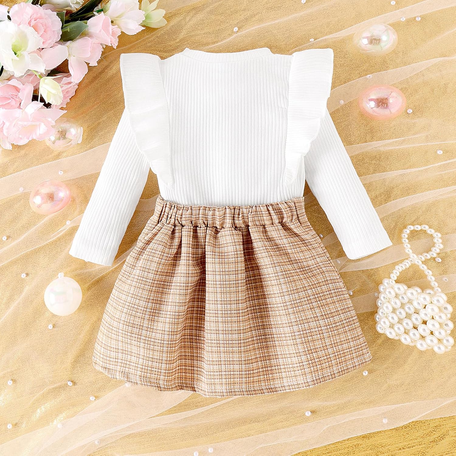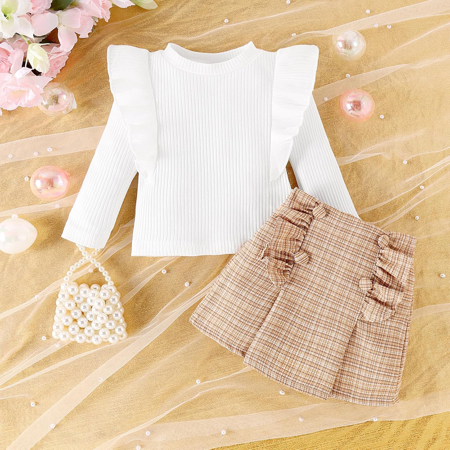 Girls Autumn 2PCS Skirt Outfits Long Sleeve Ruffle Ribbed Tops A-line Plaid Skirt Set