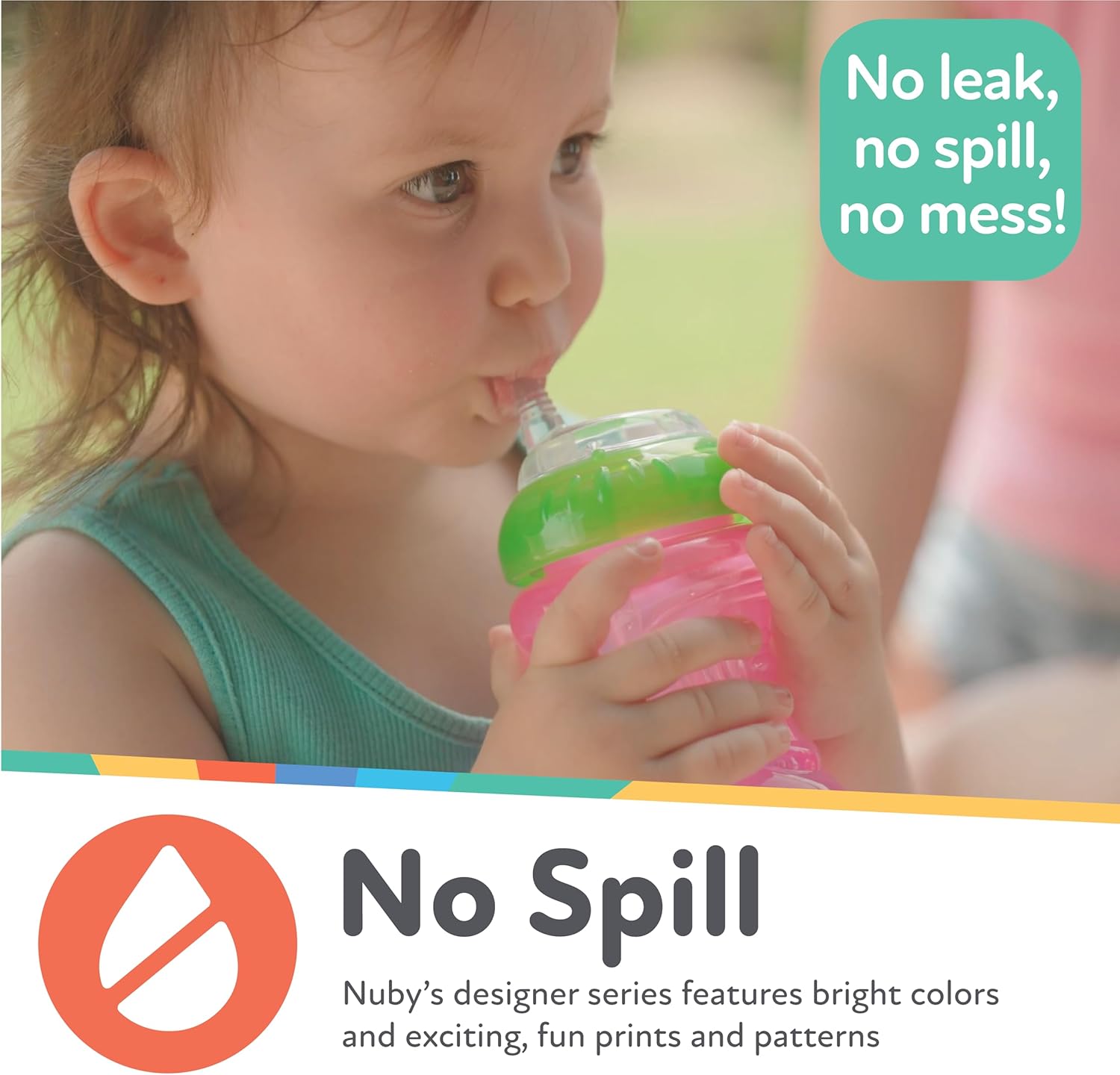 The Nuby No-Spill Easy Grip Cup with Soft Flex Straw is great for travel and on-the-go sipping. Designed for toddlers 12+ months, the Nuby No-Spill Easy Grip Cup features a soft silicone straw that is gentle on children’s teeth and gums and an Easy-Grip base contoured for little hands. The soft straw is designed with our pressure-sensitive TOUCH-FLO valve to help prevent drips and spills, opening only with the pressure from their mouth. Each cup holds 10 ounces (300 mL) of liquid. This set of three includes one orange sippy cup, one blue sippy cup, and one green sippy cup. Avoid the messy clean up of spills and leaks with the Nuby No-Spill Easy Grip Cup with Soft Flex Straw!