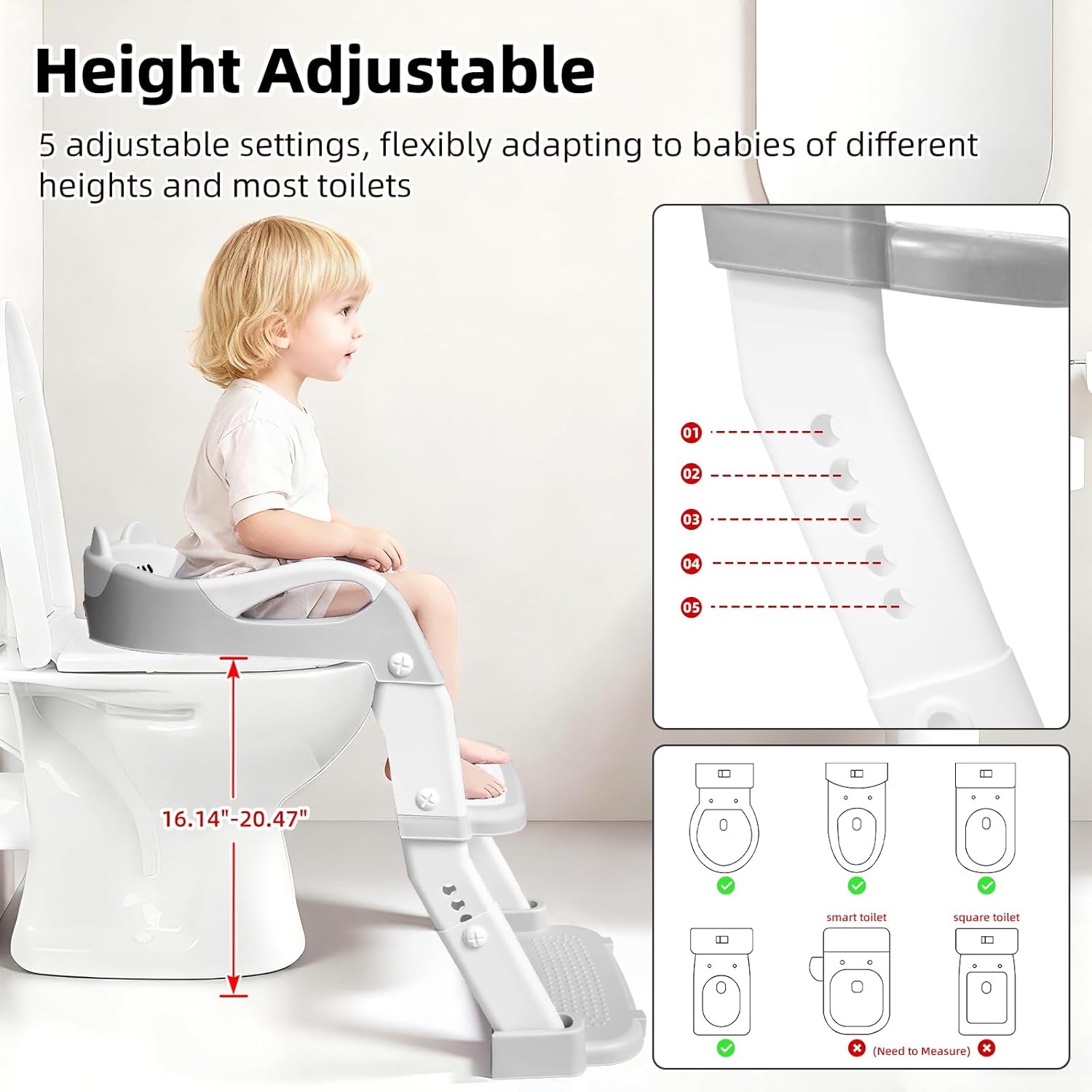 Height Adjustable: With 5 adjustable height settings (ranging from 16.14 to 20.47 inches), this training potty easily adapts to children of different ages, ensuring a comfortable toilet experience. This height-adjustable design makes it an ideal toddler potty training solution for long-term use.