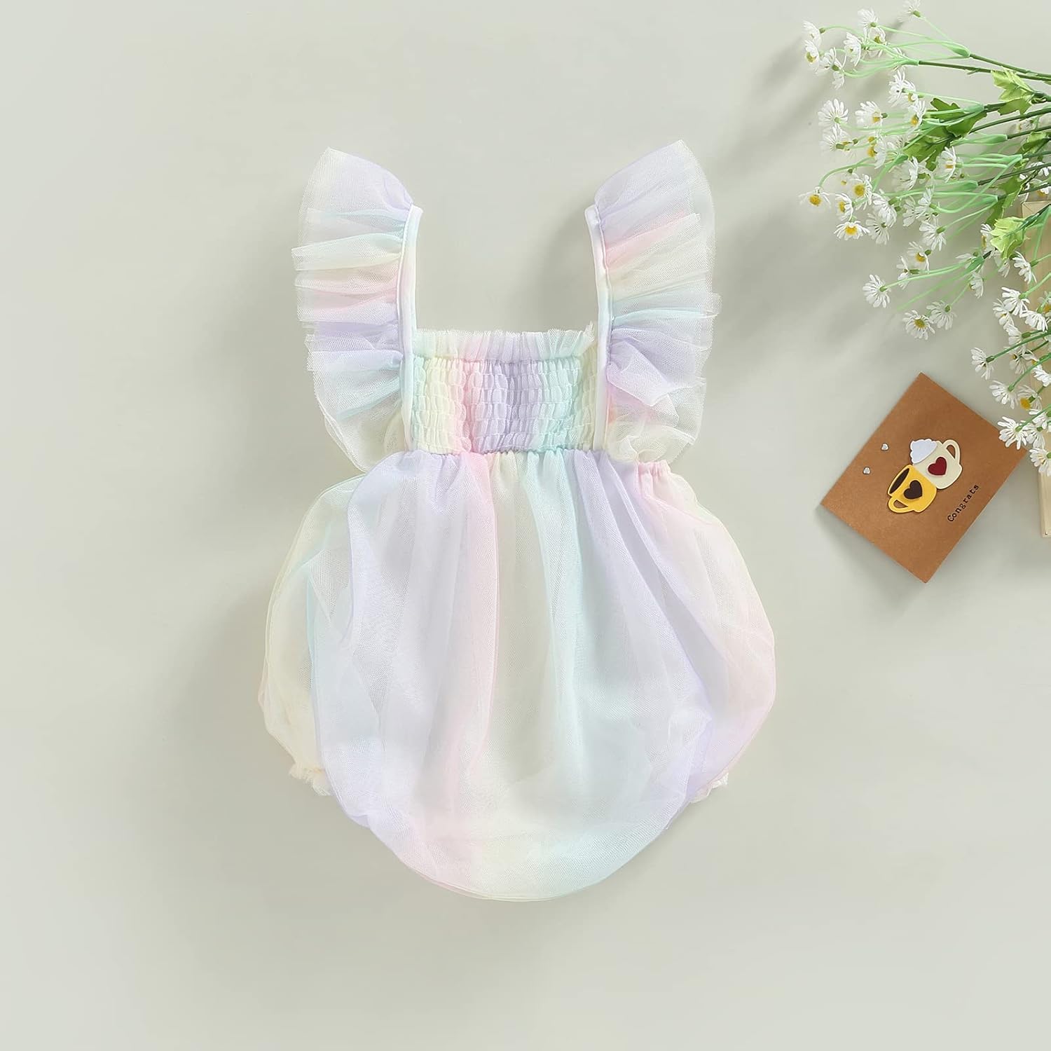 Baby girl summer romper; Baby girl romper dress with mesh patchwork, beautiful tassels, square neck, bubble short sleeves; Bottom button closure, easy to put on and take off; And cute headband set, simple but fashionable, make your baby so cute