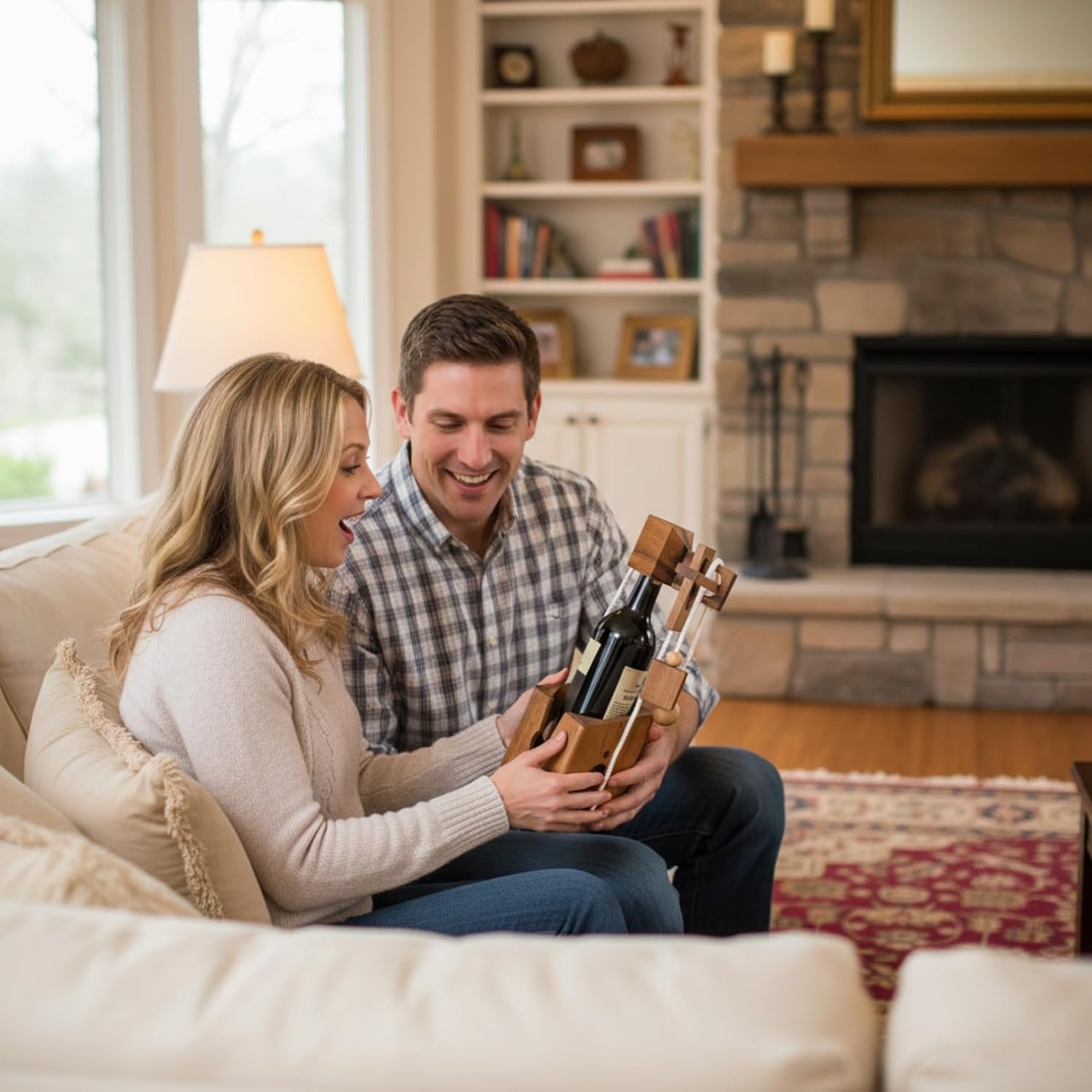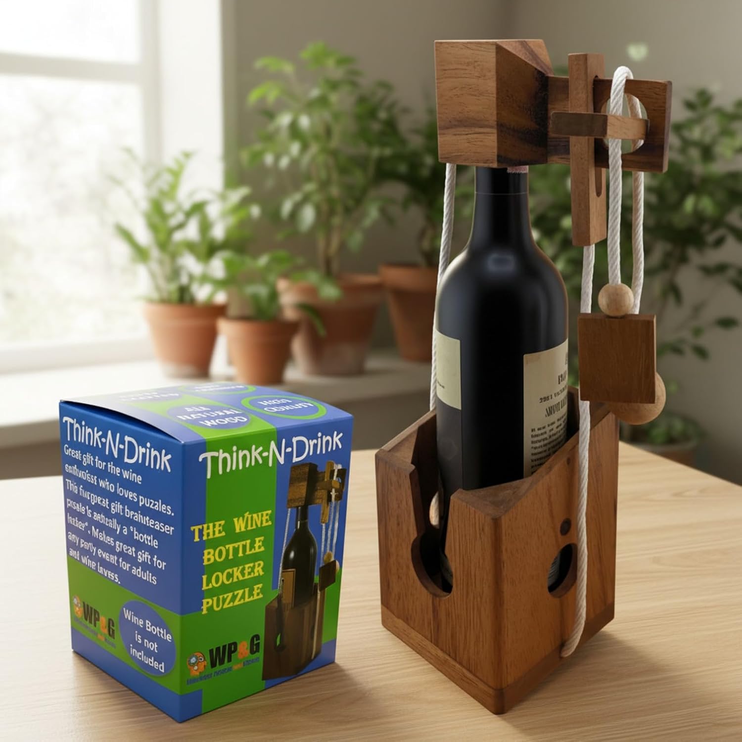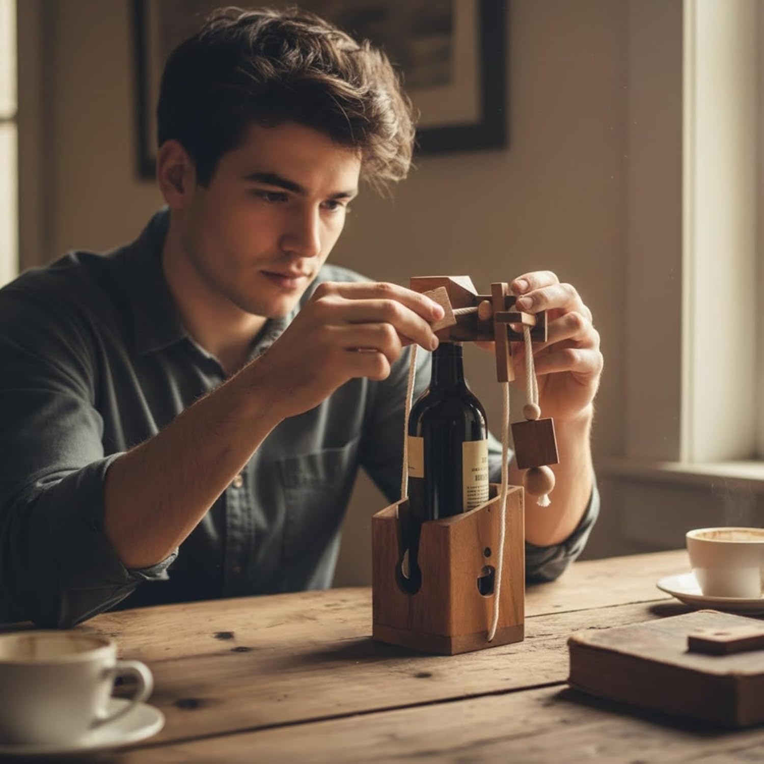 Elevate the traditional gesture of handing over a bottle of wine to a fun and exciting level by locking it in this clever wooden puzzle brain teaser for a non-traditional mind-blowing challenge!