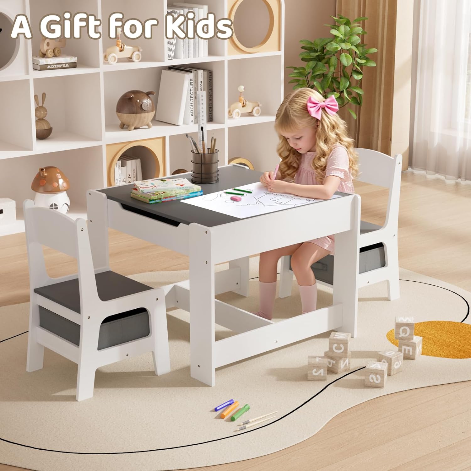 【Multi-Activity Table】: This wooden activity table has a detachable graffiti tabletop. One side is a blackboard for chalk drawing/writing, nurturing imagination and creativity. The other is an easy-clean gray board, ideal for meals and homework