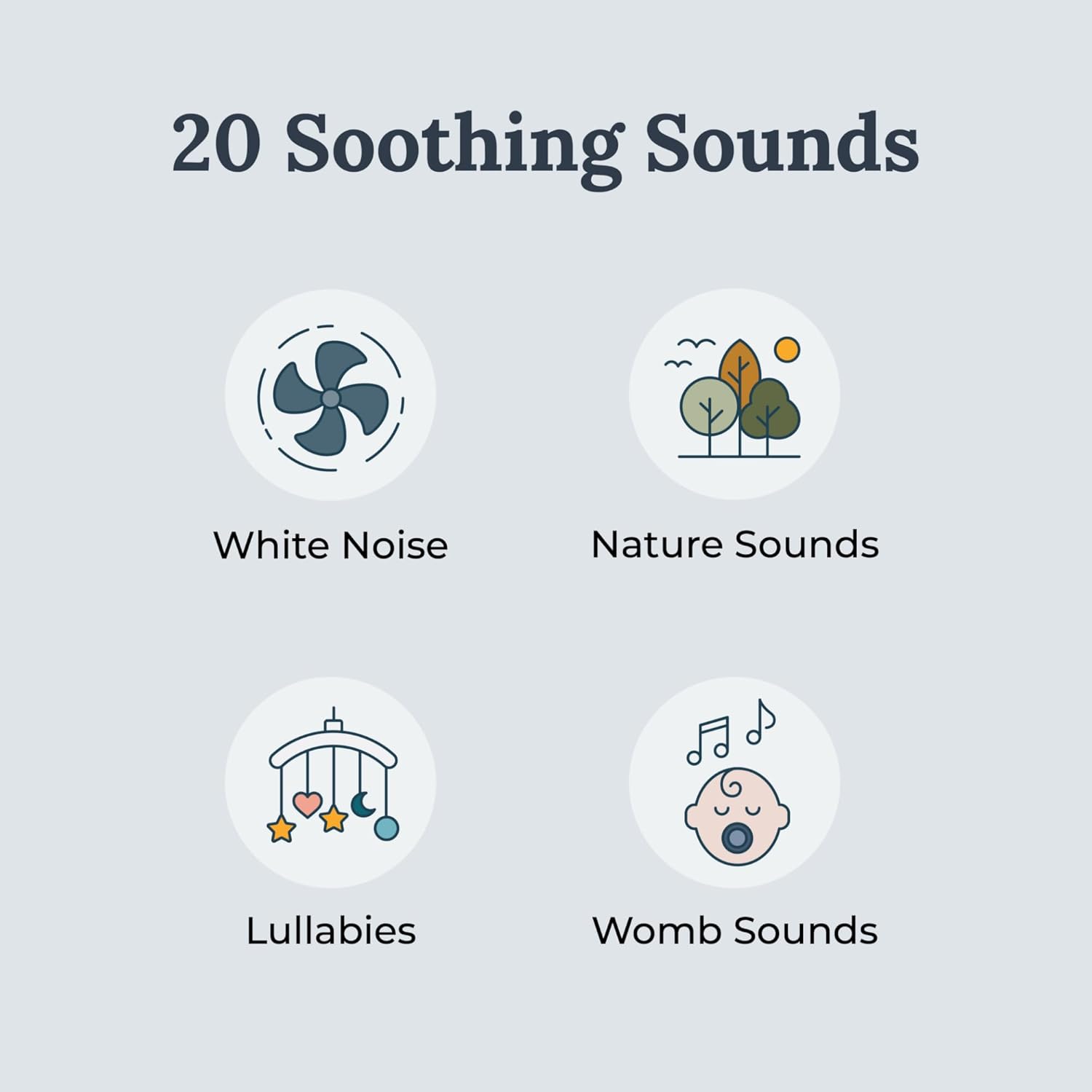 20 CURATED SLEEP TRACKS: Plays 20 curated sleep sounds including white noise, nature sounds, and sleep songs. Includes womb sounds and lullabies.